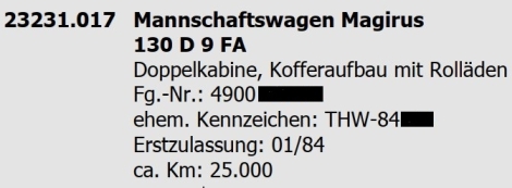 Das Bild neben diesem Absatz zeigt den Angebotseintrag in der Verkaufsausschreibung der Vebeg von damals. Nicht sehr viel Information und Fotos waren damals auch eher die Ausnahme. Daher kann ich auch nicht mehr sagen was genau außer der Adresse der Verkaufsstelle mein Interesse geweckt hat. Jedenfalls bin ich der Empfehlung der Vebeg gefolgt und habe einen Besichtigungstermin beim THW vereinbart. Nun begab es sich zu der Zeit, daß die Elbe der Meinung war über die Ufer treten zu müssen. Über das ganze Einsatzgeschehen hat man dann meinen Besichtigungstermin vergessen, und ich stand dort dann alleine auf dem Hof. Es kam dann aber doch noch jemand vorbei, der mir das Auto zeigen konnte, aber nähere Informationen hatte er nicht für mich.